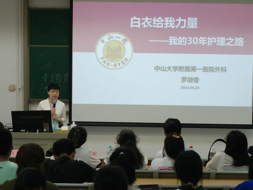 附属第一医院术科片教学片长罗凝香老师作了题为《白衣给我力量——我的30年护理之路》的分享,她结合医院发展平台,详细介绍了自己30年临床护理工作的经历,并寄语同学们要学会沉淀,读好“护理”这本“大”书,读好“实践”这本“活”书,读好“生命”这本“天”书,立足大学高地,努力成为超越老师的学生。